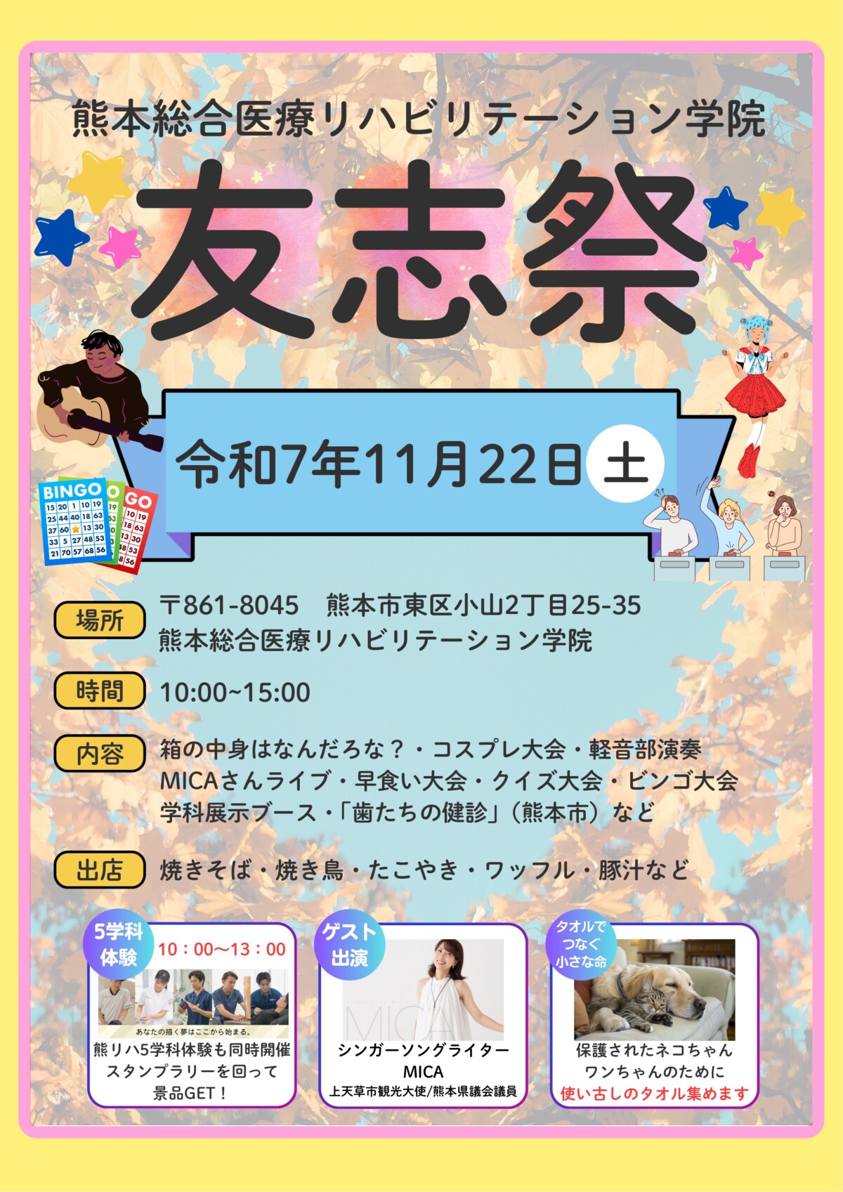 | 熊本総合医療リハビリテーション学院の文化祭です! どなたでも来場できます♫ 皆様のご来場をお待ちしております。 |